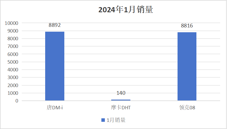 过去一年里,唐DM-i月均销量在1万辆以上,领克08也在8000辆以上,摩卡DHT月均只有300多辆。