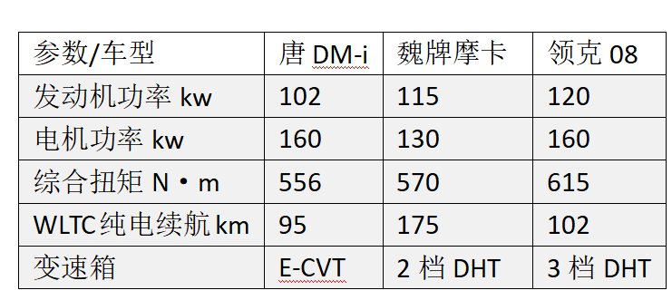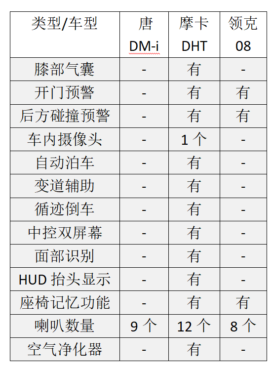 表:唐DM-i、摩卡DHT、领克08低配车型配置区别