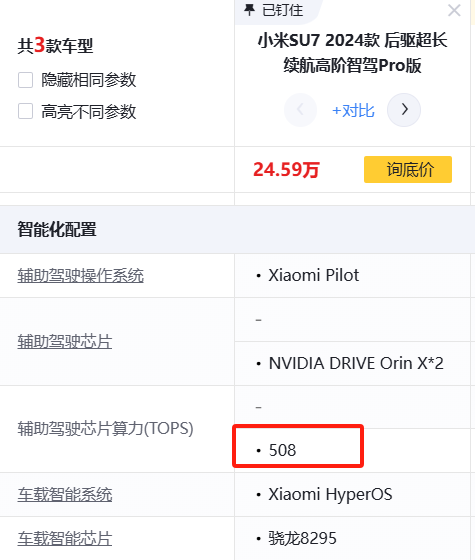SU7一开始就上了508TOPS的芯片,占了智驾硬件优势,当然不用更新,车主也心里踏实。