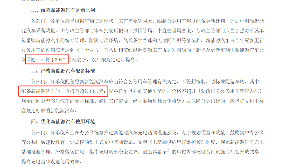 二是各机关事业单位购买新能源轿车价格不能超过18万元,