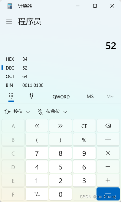 3)神秘方法:当然,在编程中没有人会亲自运算32位甚至64位的二进制的数值,我们也可以利用电脑自带的计算器来进行各进制之间的转换,利用计算器的程序员模式,输入某一进制的数值就会同时得到其他进制的数值,方便又好用!