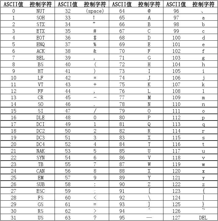| 二进制 | 十六进制 | 二进制 | 十六进制 |