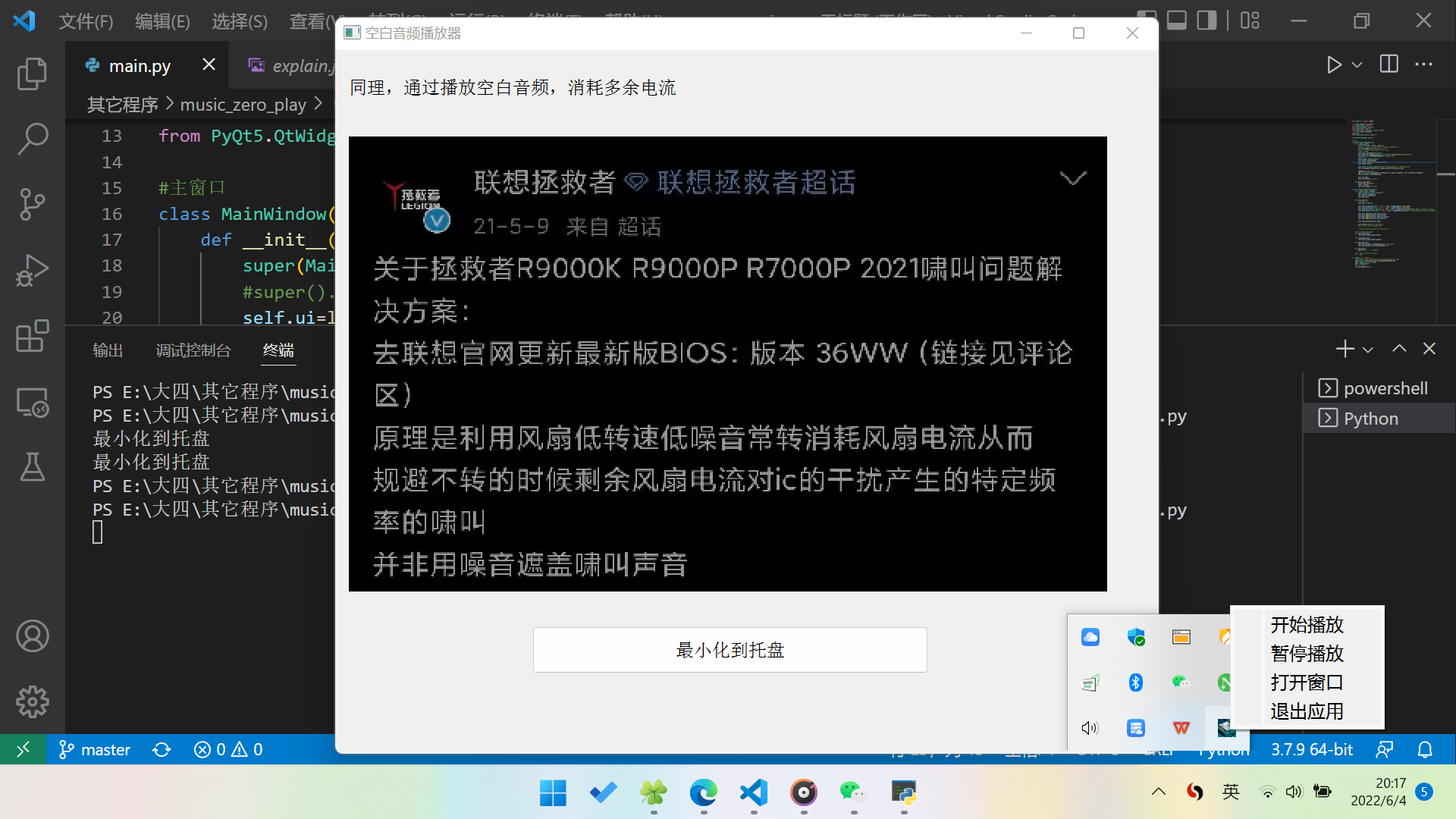 这篇博客介绍了如何使用PyQt5库来创建一个应用,该应用不仅包含程序托盘功能,还能循环播放音频。作者通过研究和实践,逐步实现了从窗口最小化到托盘、播放音频、循环播放以及设置托盘菜单等功能,并探讨了相关API的使用方法。最终,虽然在不同环境下托盘功能出现了一些问题,但整体上实现了预期效果。