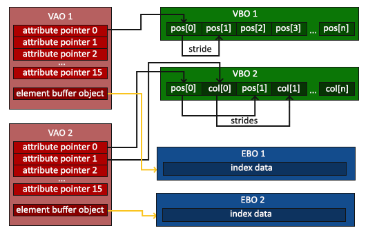 struct VertexAttributeState { bool bIsEnabled = false; int iSize = 4; //This is the number of elements in each attrib, 1-4. unsigned int iStride = 0; VertexAttribType eType = GL_FLOAT; bool bIsNormalized = false; bool bIsIntegral = false; void * pPtrOrBufferObjectOffset = 0; BufferObject * pBufferObj = 0; }; struct VertexArrayObjectState { BufferObject *pElementArrayBufferObject = NULL; VertexAttributeState attributes[MAX_VERTEX_ATTRIB]; }