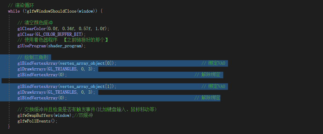 - VAO+VBO,可以少写点代码,一句就画出了2个三角形。【与下面的那个”渲染的代码“是呼应的】