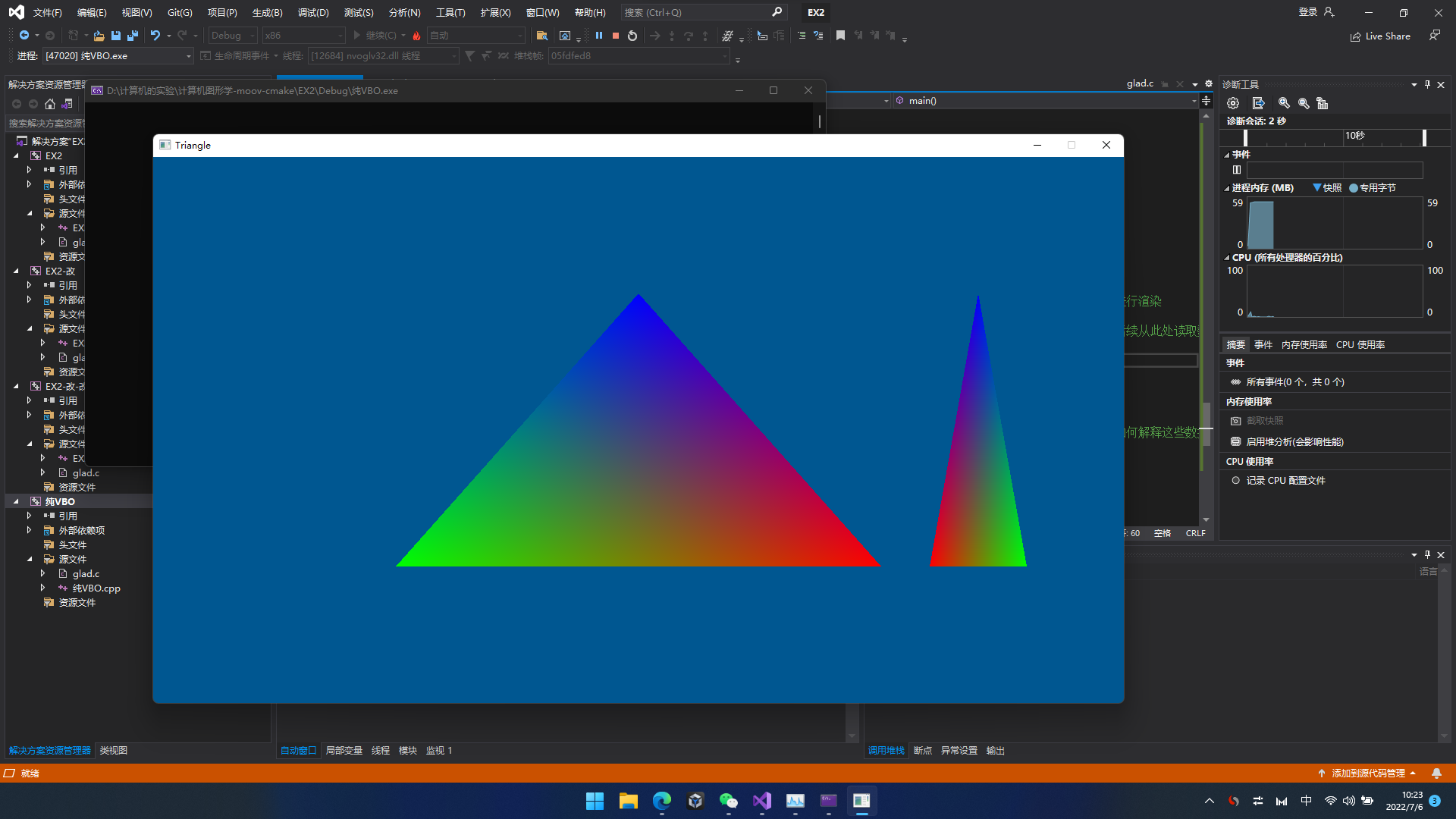 拿前面那个绘制彩色三角形的改了改,也实现了纯VBO——没用VAO,只搞了两个VBO,用来存这两个三角形的数据。