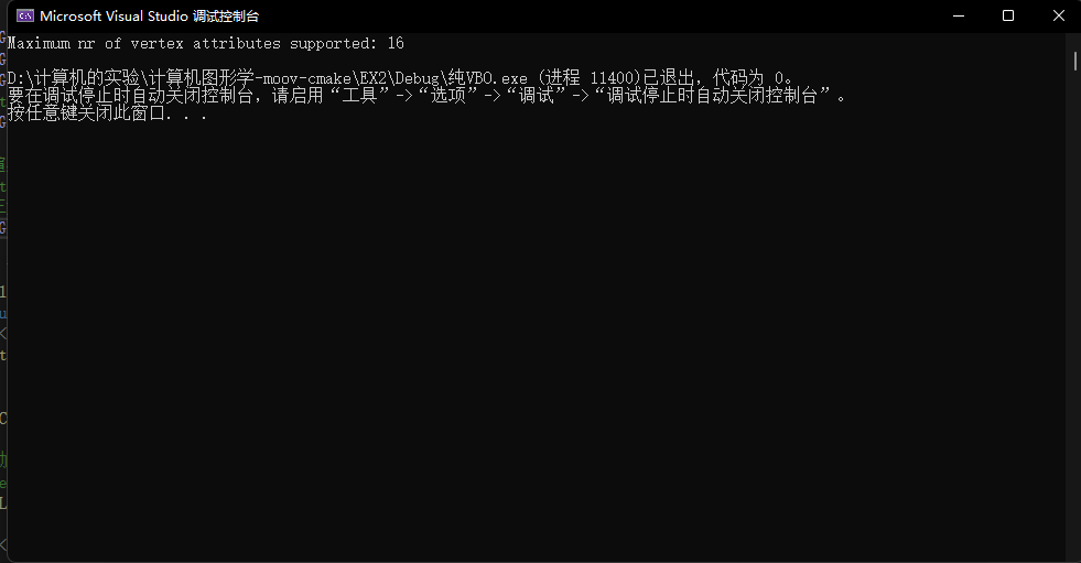 #include <iostream> #include "glad/glad.h" #include "GLFW/glfw3.h" // 屏幕宽,高 int screen_width = 1280; int screen_height = 720; int main() { // 第一部分,初始化GLFW和GLAD,分为4个步骤进行///////////////////////////////////////////////////////// // 初始化GLFW glfwInit(); // 初始化GLFW glfwWindowHint(GLFW_CONTEXT_VERSION_MAJOR, 3); // OpenGL版本为3.3,主次版本号均设为3 glfwWindowHint(GLFW_CONTEXT_VERSION_MINOR, 3); glfwWindowHint(GLFW_OPENGL_PROFILE, GLFW_OPENGL_CORE_PROFILE); // 使用核心模式(无需向后兼容性) //glfwWindowHint(GLFW_OPENGL_FORWARD_COMPAT, GL_TRUE); // 如果使用的是Mac OS X系统,需加上这行 glfwWindowHint(GLFW_RESIZABLE, false); // 不可改变窗口大小 // 必须使用VAO渲染 //glfwWindowHint(GLFW_OPENGL_PROFILE, GLFW_OPENGL_CORE_PROFILE); // 渲染出纯VBO三角形 glfwWindowHint(GLFW_OPENGL_PROFILE, GLFW_OPENGL_COMPAT_PROFILE); // 创建窗口(宽、高、窗口名称) auto window = glfwCreateWindow(screen_width, screen_height, "Triangle", nullptr, nullptr); if (window == nullptr) { // 如果窗口创建失败,输出Failed to Create OpenGL Context std::cout << "Failed to Create OpenGL Context" << std::endl; glfwTerminate(); return -1; } glfwMakeContextCurrent(window); // 将窗口的上下文设置为当前线程的主上下文 // 初始化GLAD,加载OpenGL函数指针地址的函数 // 在调用任何OpenGL函数之前 if (!gladLoadGLLoader((GLADloadproc)glfwGetProcAddress)) { std::cout << "Failed to initialize GLAD" << std::endl; return -1; } // 指定当前视口尺寸(前两个参数为左下角位置,后两个参数是渲染窗口宽、高) glViewport(0, 0, screen_width, screen_height); //查询硬件支持的顶点属性的上限 int nrAttributes; glGetIntegerv(GL_MAX_VERTEX_ATTRIBS, &nrAttributes); std::cout << "Maximum nr of vertex attributes supported: " << nrAttributes << std::endl; return 0; }运行结果