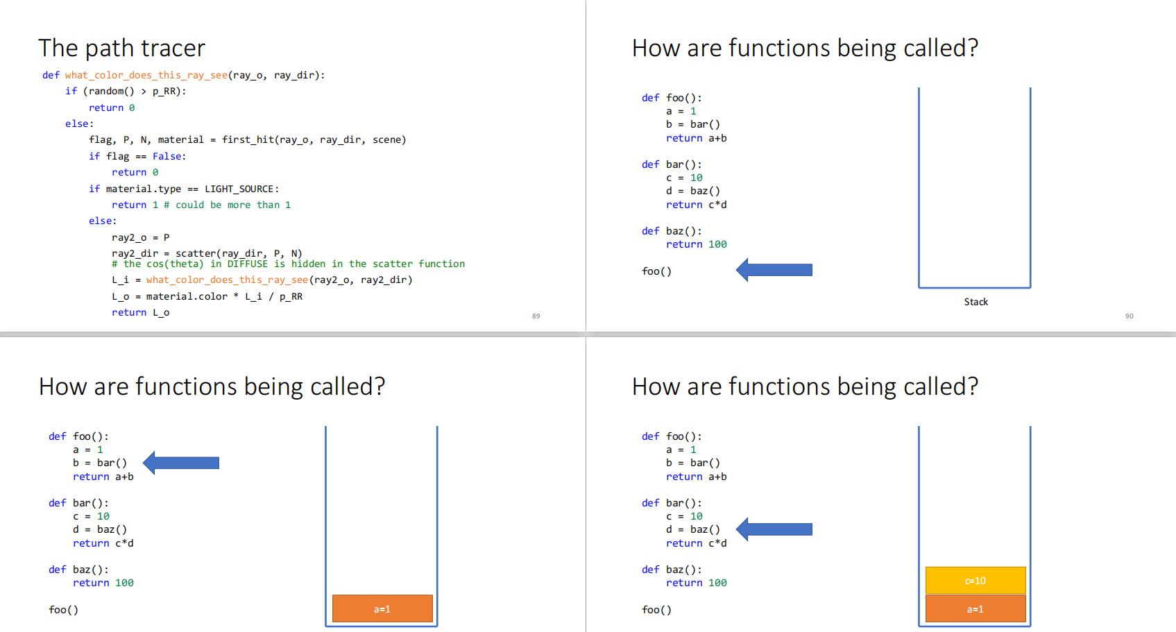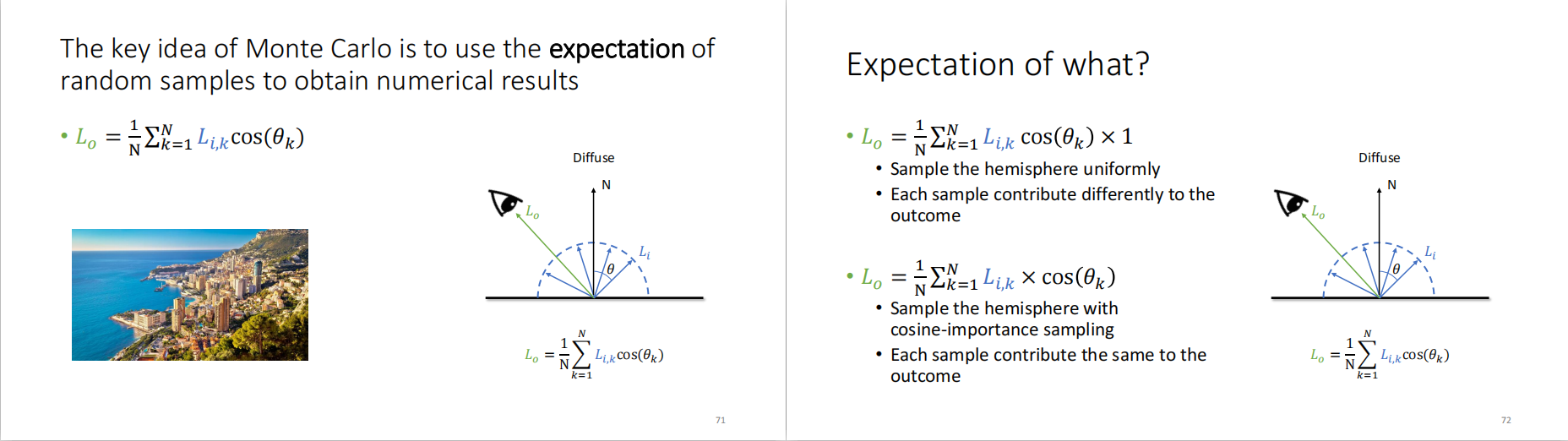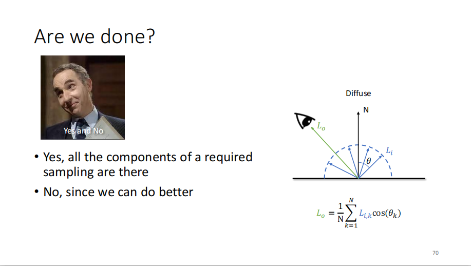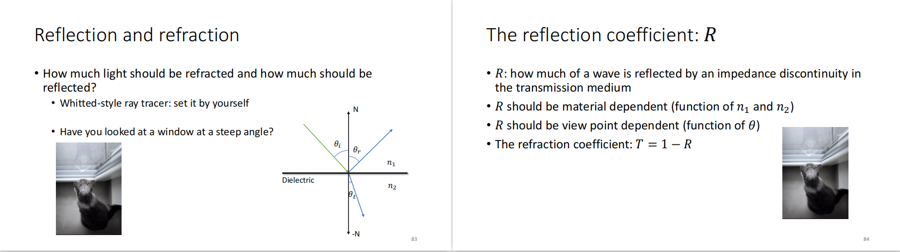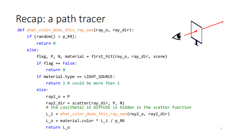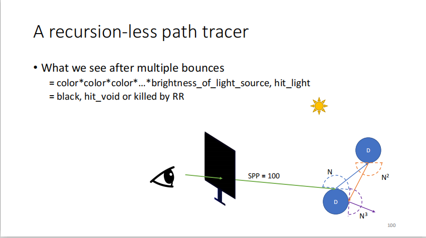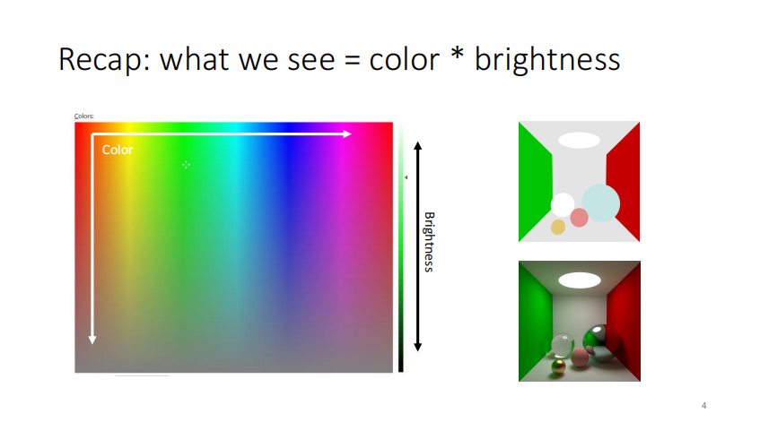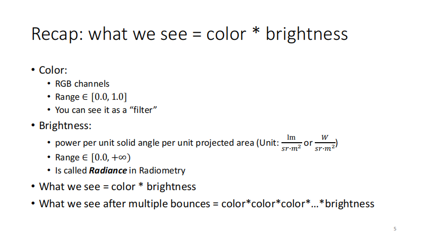 - 光追,多次反射,那就多乘几次【弹幕:亮度是有单位的,连乘之后量纲就不对了,颜色可以被认为是个过滤器/衰减器】