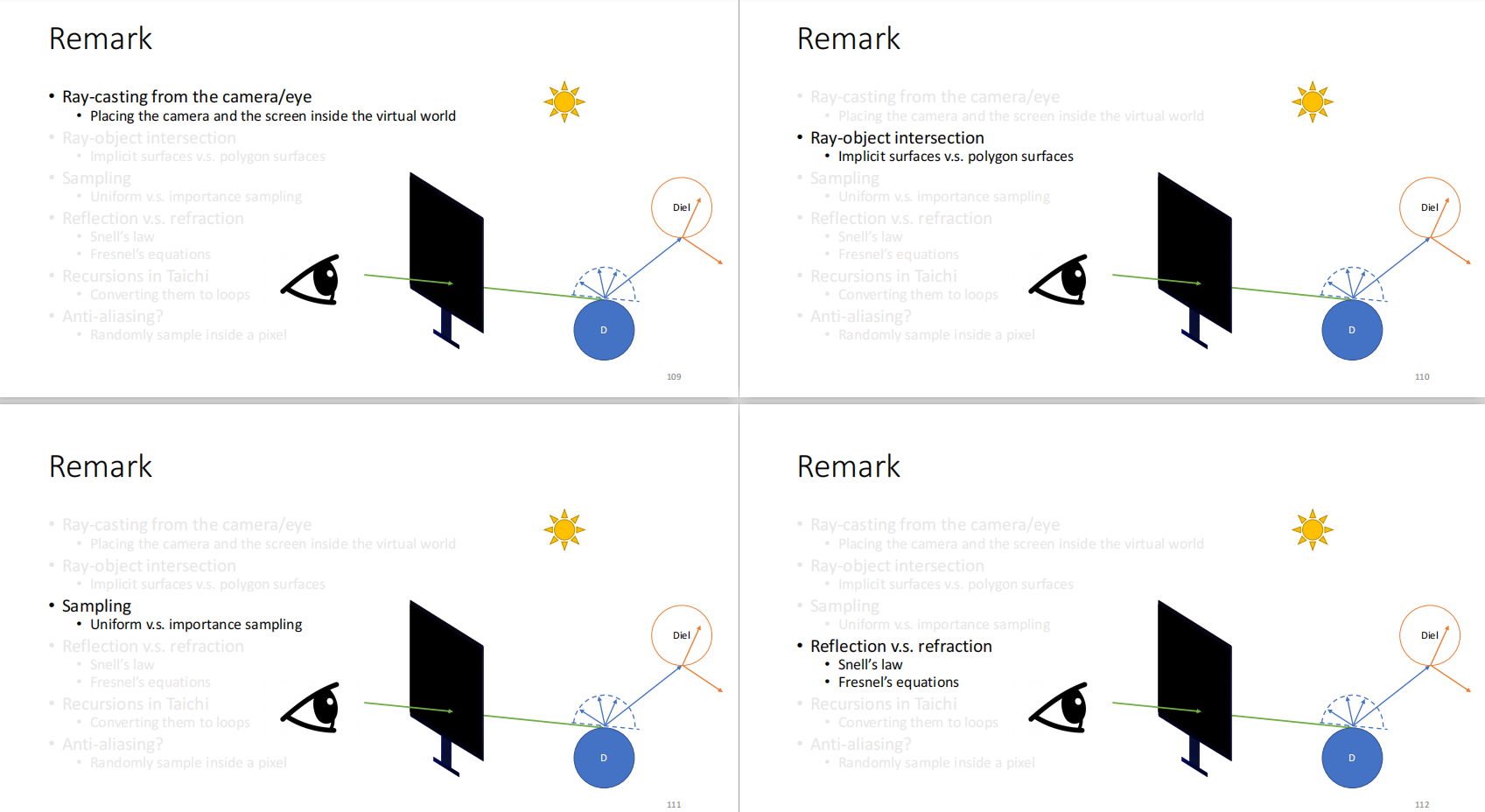 本文详细讲解了光线追踪的实现过程,包括如何发射光线、计算交点、处理反射与折射、解决数值精度问题以及应用抗锯齿技术进行反走样。通过实例展示了从基本的光线与球体交点计算到复杂的菲涅尔效应,以及从递归到非递归的转换,探讨了图形学中的数理基础和编程技巧。