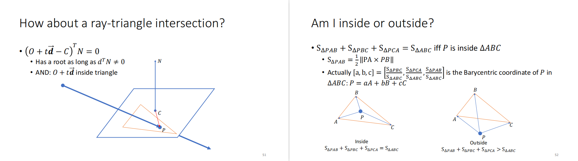 重心坐标,面积关系,可以判断某点是否在三角形内,与上面的结合一下,就完成了射线与三角形的求交