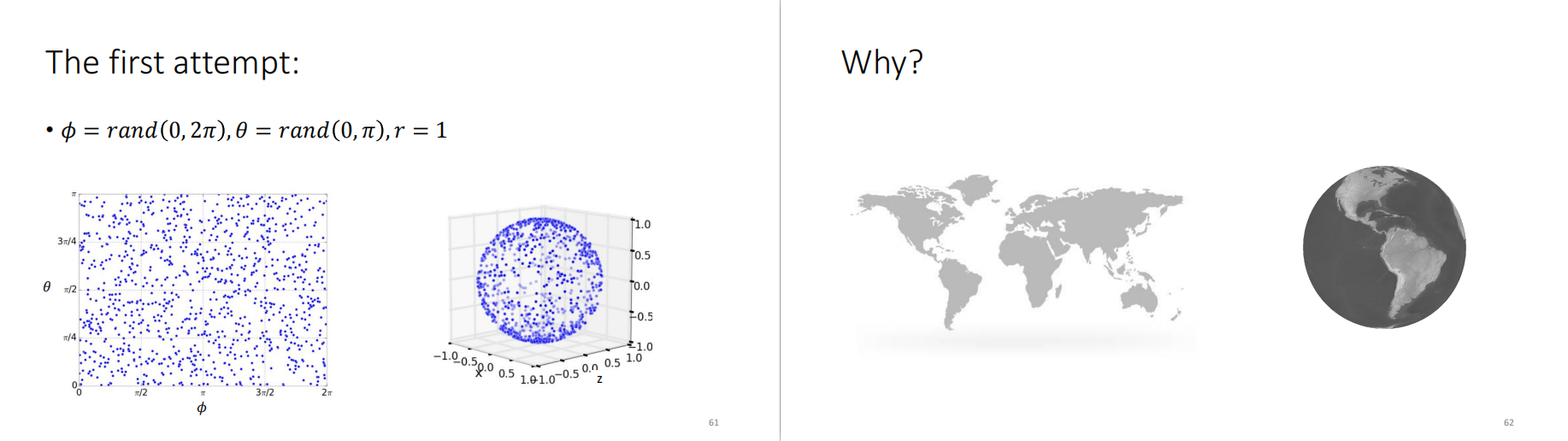 忽略R=1,三维球坐标就转化成了二维坐标,把这些二维散点映射到球上的时候,两极的点会密一些