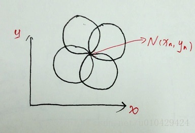 假设有一点N (xn, yn),我们知道通过N的圆有无穷多个,比如下图中,我画出了4个通过N的圆。对于所有通过点N的圆来讲,势必满足公式:(xn-a)²+(yn-b)²=r²成立。其中,因为N是已知的,所以xn,yn是定值。而那些通过N的圆,有无穷多种,圆心、半径都是不一定的,所以a,b,r都是变量。