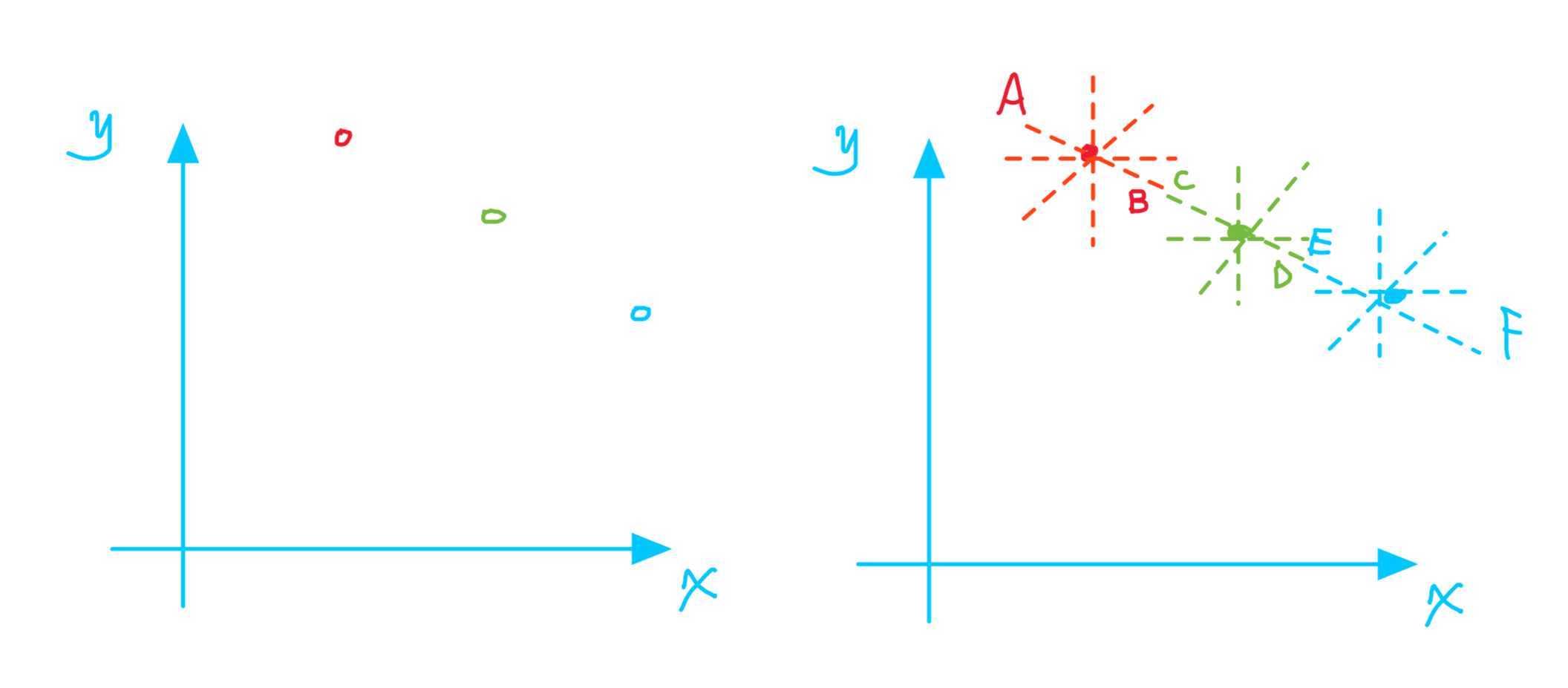怎么计算?把过RGB三个点的所有直线都画出来,看有没有一条直线是它们三个点公共的,有的话【比如下图里的ABCDEF直线】,ABC就共线。,这个直线就检测出来了。