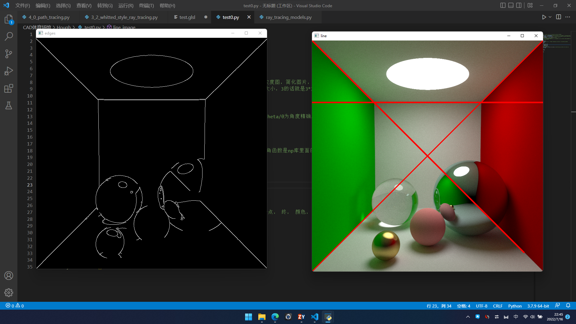 lines = cv.HoughLines(edges, 1, np.pi / 180, 200) # 霍夫变换进行形状检测