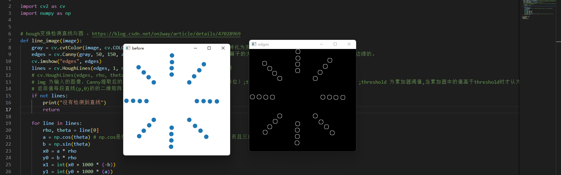 # -*- coding=GBK -*- import cv2 as cv import numpy as np def line_image(image): gray = cv.cvtColor(image, cv.COLOR_BGR2GRAY) # 灰度图像 edges = cv.Canny(gray, 50, 200) lines = cv.HoughLinesP(edges, 1, np.pi/180, 30, minLineLength=60, maxLineGap=10) lines1 = lines[:, 0, :] # 提取为二维 for x1, y1, x2, y2 in lines1[:]: cv.line(image, (x1, y1), (x2, y2), (255, 0, 0), 1) cv.imshow("line", image) src = cv.imread("Line.png") cv.imshow("before", src) line_image(src) cv.waitKey(0) cv.destroyAllWindows()引用自: