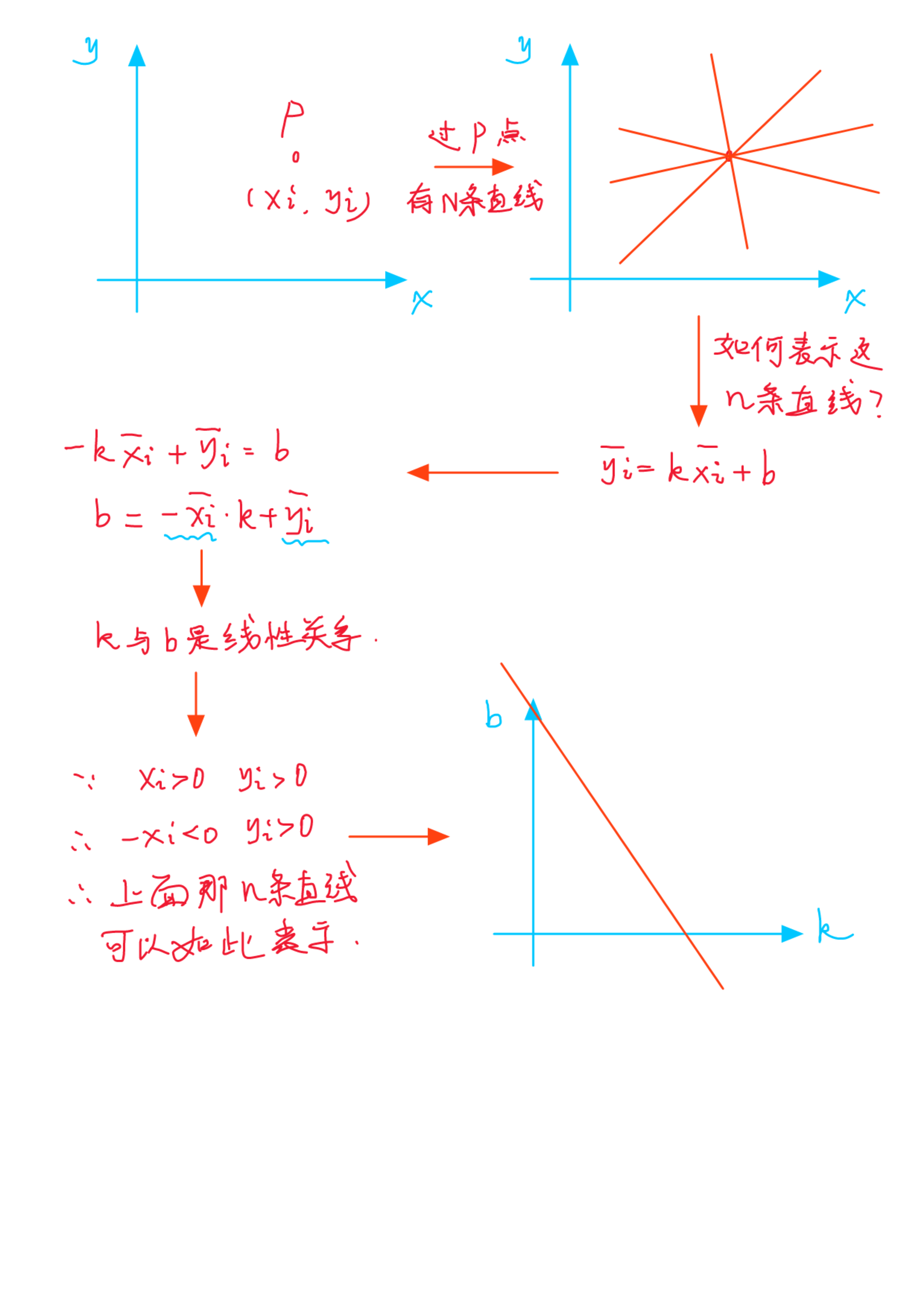 通过 r-o-theta 坐标系可更直观表示这种关系,如下图:图中三个点的【r,θ】曲线汇集在一起,该交点就是同时经过这三个点的直线。引用自: