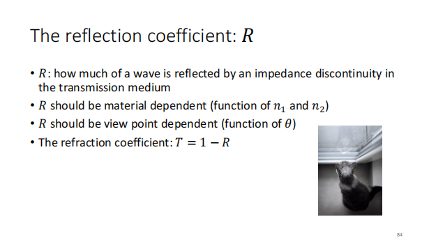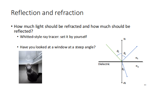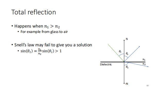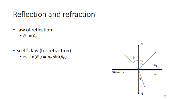 - 和入射角有关。当入射角很小的时候,反射率R会很低,几乎全是透射;当入射角比较大的时候,反射的就变多了。【参考看远近的湖水。看近处,入射角小,透射多,能看到底。看远处,入射角大,反射率大,就看不到底,只能看到波光粼粼】
