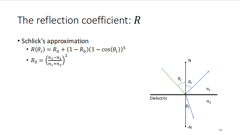 - 和两材质折射率的差有关。当材质相同的时候,R0=0,全部投射,没有反射