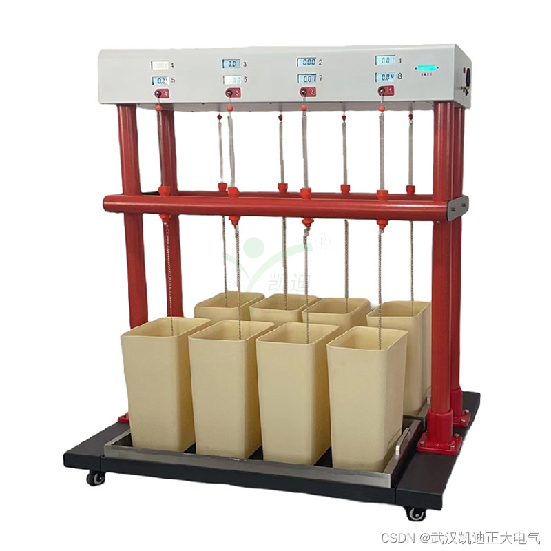 该装置结合高压电源和控制系统,提供便捷的接线和检测体验。具备六桶测试能力,数字显示电流表进行实时监控,配备软链电极和精密加工电极以减少表面放电。技术指标包括3kVA额定容量,AC220V输入,最高30kV输出电压等。