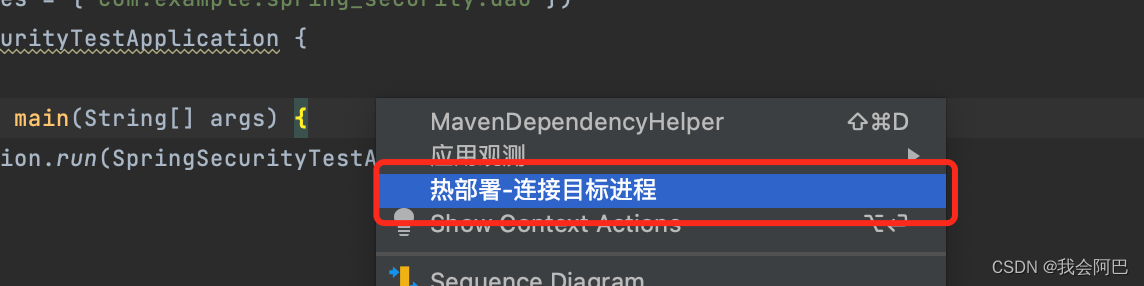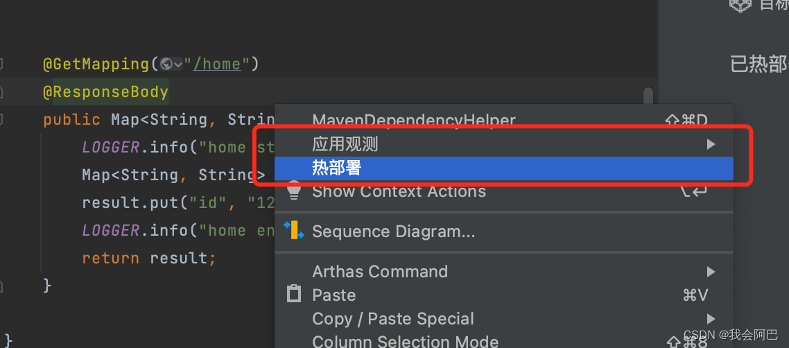 步骤三:建立连接后,在想要热部署的源码文件上右击(或者直接在类中右击选择热部署),选择“热部署”。(可以先进行热部署,测试是否成功后再改动代码,再次点击热部署改动代码才能生效)