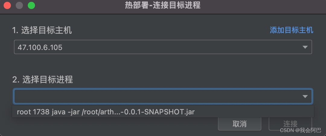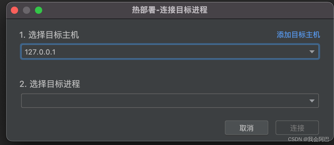 3.目前功能不支持目标主机为本地服务器地址,如果选择是本地目标主机地址,则选择目标进程为空(同官方人员确认!!!别踩坑,不是你本地配置问题!!!),如下图所示