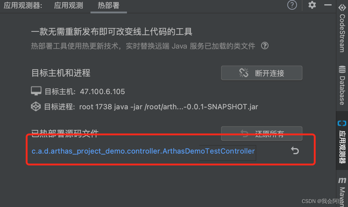 2.热部署不能和arthas服务器同时启动,否则热部署链接目标进程会失败