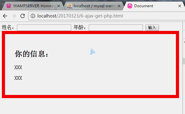 1 <!DOCTYPE html> 2 <htmllang="en"> 3 <head> 4 <metacharset="UTF-8"/> 5 <title>Document</title> 6 </head> 7 <body> 8 <!-- <form action="" method=""> --> 9 <!-- <label> --> 10 姓名:<inputtype="text"name="user"> 11 <!-- </label> --> 12 <!-- <label> --> 13 年龄:<inputtype="text"name="age"> 14 <!-- </label> --> 15 <inputtype="button"value="输入"> 16 <!-- </form> --> 17 <divstyle="border:10px solid red;padding:30px"> 18 <h2>你的信息:</h2> 19 <p>XXX</p> 20 <p>XXX</p> 21 </div> 22 </body> 23 <scripttype="text/javascript"> 24 var btn = document.querySelector("input[type=button]"); 25 var input = document.querySelectorAll("input[type=text]"); 26 var p = document.querySelectorAll("p"); 27 var xmlhttp ; 28 if(XMLHttpRequest){ 29 // 非IE5/6 30 xmlhttp =newXMLHttpRequest(); 31 }else{ 32 // IE5/6 33 xmlhttp =ActiveXObject("Msxml2.XMLHTTP"); 34 } 35 btn.onclick =function(){ 36 var value1 = input[0].value; 37 var value2 = input[1].value; 38 // 使用open(data)设置请求参数 39 // open(method,url,bol); 40 xmlhttp.open("POST","6-ajax-get-php.php",true); 41 // 设置编码格式 42 xmlhttp.setRequestHeader('Content-type','application/x-www-form-urlencoded'); 43 // 使用send发送请求 44 xmlhttp.send("name="+value1+"&age="+value2); 45 } 46 xmlhttp.onreadystatechange =function(){ 47 if(xmlhttp.readyState ==4&& xmlhttp.status ==200){ 48 var data = xmlhttp.responseText; 49 console.log(data); 50 var str = JSON.parse(data); 51 p[0].innerText = str.name; 52 p[1].innerText = str.age; 53 } 54 } 55 </script> 56 </html>