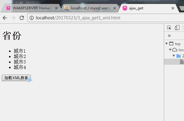 1 <!DOCTYPE html> 2 <htmllang="en"> 3 <head> 4 <metacharset="UTF-8"> 5 <title>ajax_get</title> 6 </head> 7 <body> 8 <h1>省份</h1> 9 <ul> 10 <li>城市1</li> 11 <li>城市2</li> 12 <li>城市3</li> 13 <li>城市4</li> 14 </ul> 15 <button>加载XML数据</button> 16 </body> 17 <scripttype="text/javascript"> 18 // 获取按钮 19 var btn = document.querySelector("button"); 20 var h1 = document.querySelector("h1"); 21 var lis = document.querySelectorAll("li"); 22 // 1.创建对象 23 var xmlhttp ;//自定义对象 24 // 考虑兼容性写法IE5/6 25 // 判断浏览器是否支持XMLHttpRequest(); 26 if(XMLHttpRequest){ 27 // 非IE5/6 28 xmlhttp =newXMLHttpRequest(); 29 }else{ 30 // IE5/6 31 xmlhttp =ActiveXObject("Msxml2.XMLHTTP"); 32 } 33 // js中添加绑定事件addEventListener(); 34 // 添加点击事件 35 btn.onclick =function(){ 36 // 使用open(data)设置请求参数 37 // open(method,url,bol); 38 xmlhttp.open("GET","2-city.xml",true); 39 // 使用send发送请求 40 xmlhttp.send(); 41 } 42 // 响应服务器 43 // 给xmlhttp对象添加onreadystatechange事件 44 xmlhttp.onreadystatechange =function(){ 45 // 两类,1.readyState与status 46 // 要判断服务器有没有异常 47 /*console.log("readyState",xmlhttp.readyState); 48 console.log("status",xmlhttp.status);*/ 49 if(xmlhttp.readyState ==4&& xmlhttp.status ==200){ 50 // 接受服务器端的数据 51 // xml,返回XML数据格式 52 // responseText 获得字符串形式的响应数据。 53 // responseXML 获得 XML 形式的响应数据。 54 var dataXML = xmlhttp.responseXML; 55 console.log(dataXML); 56 /*-------------处理数据怎么处理--------------*/ 57 // 获取XML文档里面name标签的内容 58 var name = dataXML.getElementsByTagName("name")[0].innerHTML; 59 console.log(name); 60 h1.innerText = name; 61 // 替换城市内容 62 var citys = dataXML.getElementsByTagName("city"); 63 document.querySelector("ul").innerHTML =""; 64 for(var i=0;i<citys.length;i++){ 65 var li = document.createElement("li"); 66 li.innerText = citys[i].innerHTML; 67 document.querySelector("ul").appendChild(li); 68 } 69 } 70 } 71 </script> 72 </html>