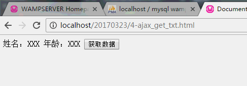 1 <!DOCTYPE html> 2 <htmllang="en"> 3 <head> 4 <metacharset="UTF-8"/> 5 <title>Document</title> 6 </head> 7 <body> 8 <label> 9 姓名:<span>XXX</span> 10 </label> 11 <label> 12 年龄:<span>XXX</span> 13 </label> 14 <button>获取数据</button> 15 </body> 16 <scripttype="text/javascript"> 17 var btn = document.querySelector("button"); 18 var span = document.querySelectorAll("span"); 19 var xmlhttp ; 20 if(XMLHttpRequest){ 21 // 非IE5/6 22 xmlhttp =newXMLHttpRequest(); 23 }else{ 24 // IE5/6 25 xmlhttp =ActiveXObject("Msxml2.XMLHTTP"); 26 } 27 btn.onclick =function(){ 28 // 使用open(data)设置请求参数 29 // open(method,url,bol); 30 xmlhttp.open("GET","get.txt",true); 31 // 使用send发送请求 32 xmlhttp.send(); 33 } 34 xmlhttp.onreadystatechange =function(){ 35 if(xmlhttp.readyState ==4&& xmlhttp.status ==200){ 36 // 获取字符串 37 var data = xmlhttp.responseText; 38 // 把字符串转换成json格式object对象 39 var str1 = JSON.parse(data); 40 // console.log(str1); 41 // console.log(dataXML); 42 var name = str1.name; 43 var age = str1.age; 44 // console.log(name); 45 span[0].innerText = name; 46 span[1].innerText = age; 47 } 48 } 49 </script> 50 </html>