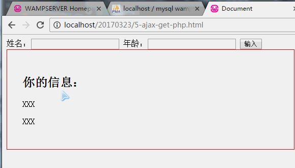 1 <!DOCTYPE html> 2 <htmllang="en"> 3 <head> 4 <metacharset="UTF-8"/> 5 <title>Document</title> 6 </head> 7 <body> 8 <!-- <form action="" method=""> --> 9 <!-- <label> --> 10 姓名:<inputtype="text"name="user"> 11 <!-- </label> --> 12 <!-- <label> --> 13 年龄:<inputtype="text"name="age"> 14 <!-- </label> --> 15 <inputtype="button"value="输入"> 16 <!-- </form> --> 17 <divstyle="border:1px solid red;padding:30px"> 18 <h2>你的信息:</h2> 19 <p>XXX</p> 20 <p>XXX</p> 21 </div> 22 </body> 23 <scripttype="text/javascript"> 24 var btn = document.querySelector("input[type=button]"); 25 var input = document.querySelectorAll("input[type=text]"); 26 var p = document.querySelectorAll("p"); 27 var xmlhttp ; 28 if(XMLHttpRequest){ 29 // 非IE5/6 30 xmlhttp =newXMLHttpRequest(); 31 }else{ 32 // IE5/6 33 xmlhttp =ActiveXObject("Msxml2.XMLHTTP"); 34 } 35 btn.onclick =function(){ 36 var value1 = input[0].value; 37 var value2 = input[1].value; 38 // 使用open(data)设置请求参数 39 // open(method,url,bol); 40 // get获取类型:获取字符在url后面加上"xxx.php?name" +value1+ "&age=" +value2 41 xmlhttp.open("GET","5-ajax-get-php.php?name="+value1+"&age="+value2,true); 42 // 使用send发送请求 43 xmlhttp.send(); 44 } 45 // 接收服务器响应的数据 46 xmlhttp.onreadystatechange =function(){ 47 if(xmlhttp.readyState ==4&& xmlhttp.status ==200){ 48 var data = xmlhttp.responseText;// 获取的是字符串 49 console.log(data); 50 var str = JSON.parse(data); 51 p[0].innerText = str.name; 52 p[1].innerText = str.age; 53 } 54 } 55 </script> 56 </html>