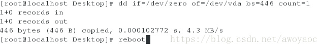 [root@localhost ~]# dd if=/dev/zero of=/dev/vda bs=446 count=1