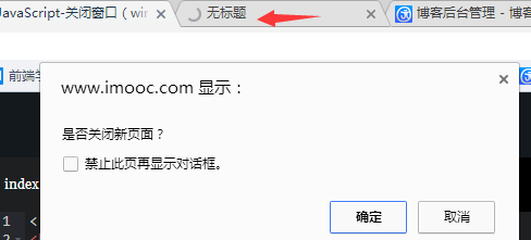 <!DOCTYPE HTML> <html> <head> <meta http-equiv="Content-Type" content="text/html; charset=utf-8" /> <title>close()</title> <script type="text/javascript"> function openUrl(){ var mywin=window.open("http://www.imooc.com"); var pages = confirm("是否关闭新页面?"); if(pages == true){ mywin.close(); alert("页面已关闭!"); }else{ alert("页面未关闭!"); } } </script> </head> <body> <input name="button" type="button" onClick="openUrl()" value="点击我,打开新的网页!" /> </body> </html>