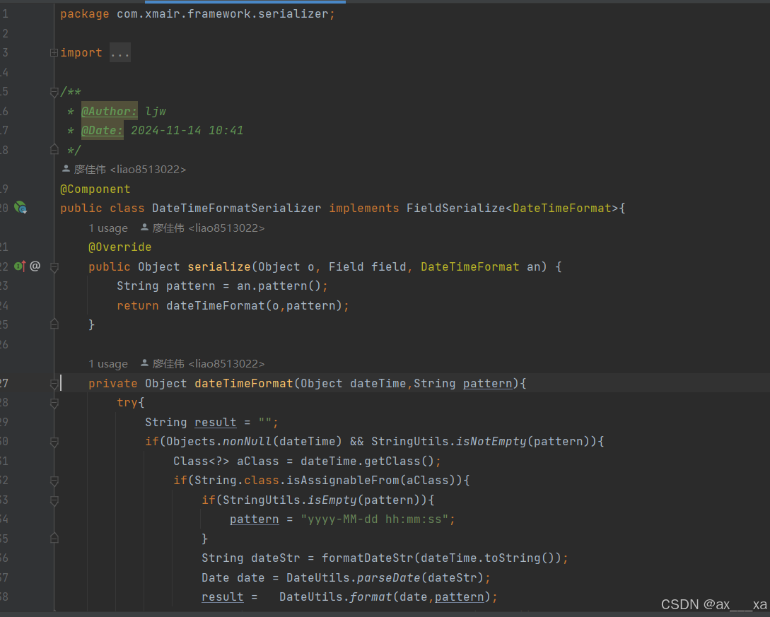 项目中还有自定的时间序列化,和上述脱敏序列化实现方式是一致的。其实上面提供了思路,还可以做更多的自定义序列化操作,如自定义序列化枚举值注解、加密注解等。