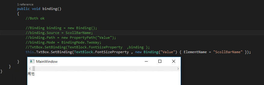 最简单的绑定情形则是将一个源对象指定为一个WPF对象,并且源属性是一个依赖属性,。之所以使用依赖属性是因为属性内置了变更通知的支持。