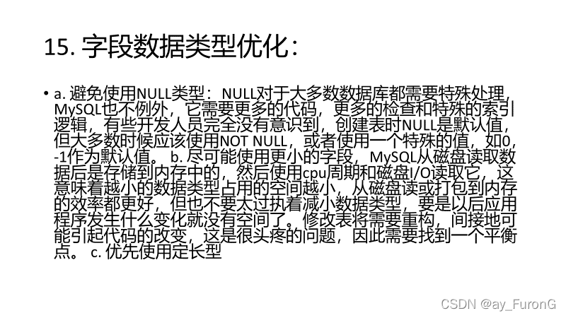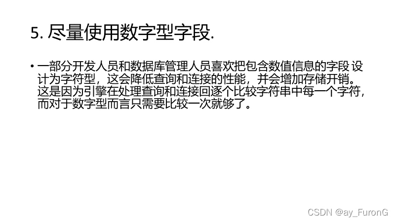 17.尽量使用数字型字段,若只含数值信息的字段尽量不要设计为字符型,这会降低查询和连接的性能,并会增加存储开销。这是因为引擎在处理查询和连接时会逐个比较字符串中每一个字符,而对于数字型而言只需要比较一次就够了。