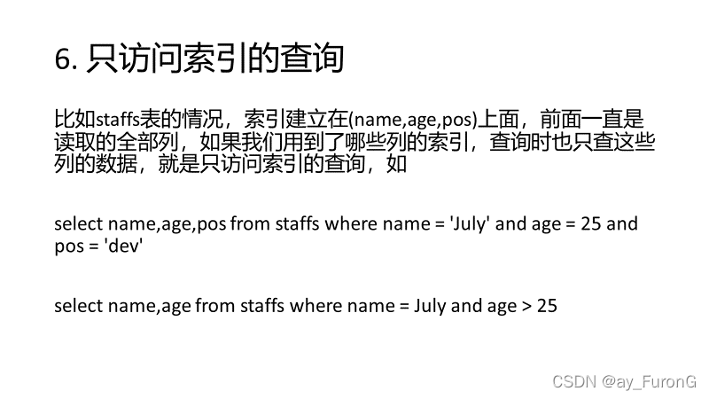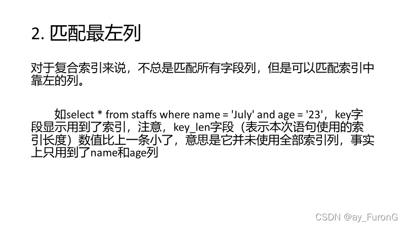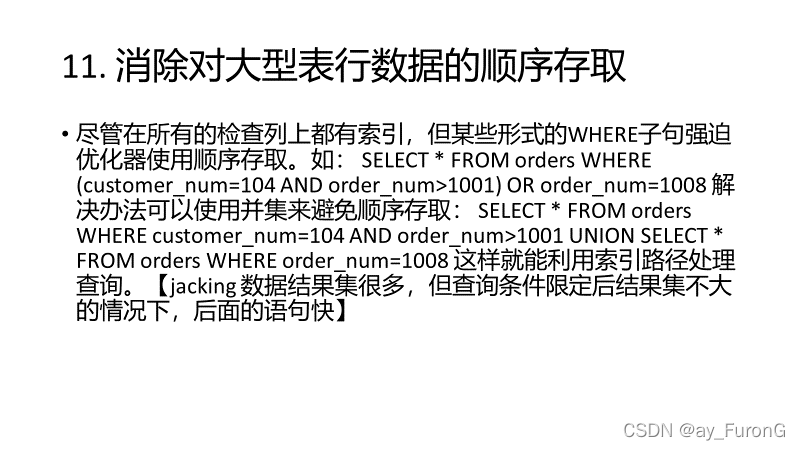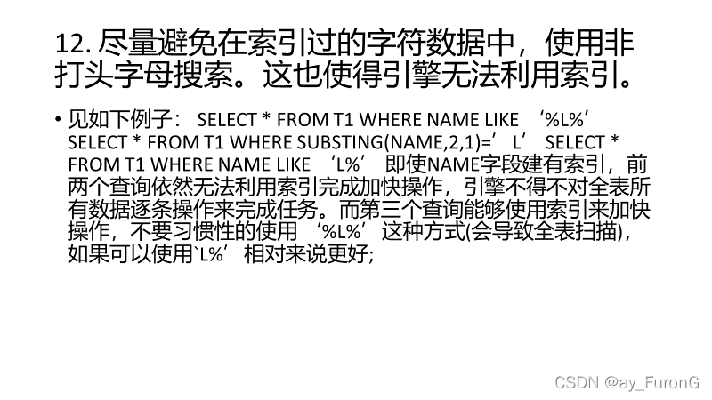 11.在使用索引字段作为条件时,如果该索引是复合索引,那么必须使用到该索引中的第一个字段作为条件时才能保证系统使用该索引,否则该索引将不会被使用,并且应尽可能的让字段顺序与索引顺序相一致。