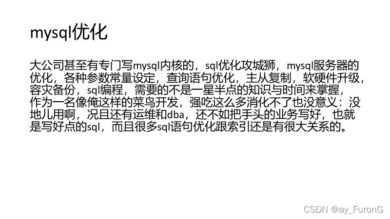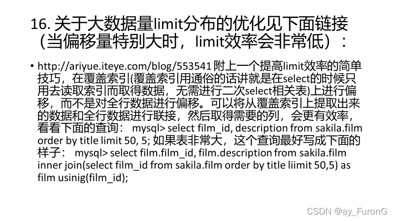 14.并不是所有索引对查询都有效,SQL是根据表中数据来进行查询优化的,当索引列有大量数据重复时,SQL查询可能不会去利用索引,如一表中有字段sex,male、female几乎各一半,那么即使在sex上建了索引也对查询效率起不了作用。