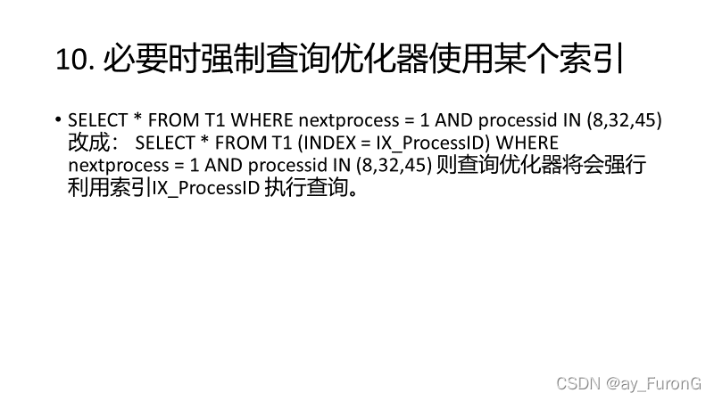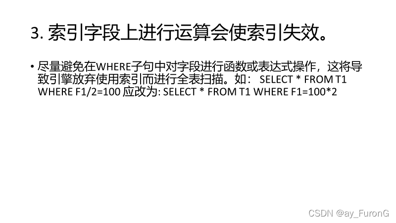 10.不要在 where 子句中的“=”左边进行函数、算术运算或其他表达式运算,否则系统将可能无法正确使用索引。