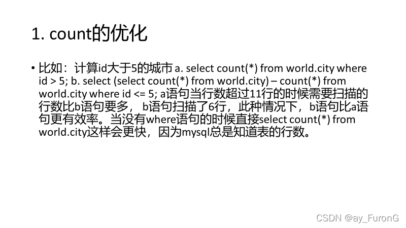 5.in 和 not in 也要慎用,否则会导致全表扫描,如:select id from t where num in(1,2,3) 对于连续的数值,能用 between 就不要用 in 了: