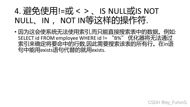 3.应尽量避免在 where 子句中使用!=或<>操作符,否则引擎将放弃使用索引而进行全表扫描。