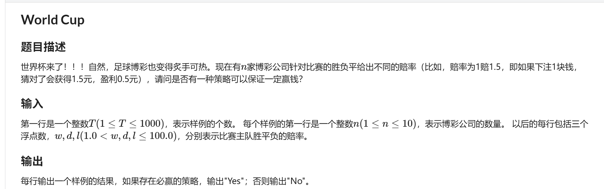 理解题目意思:就是说这n家公司分别给出的三种赔率是一定的,但是你可用决定你去哪家公司投钱,投哪种情况,当满足一定数量关系的时候就一定不会赔钱。