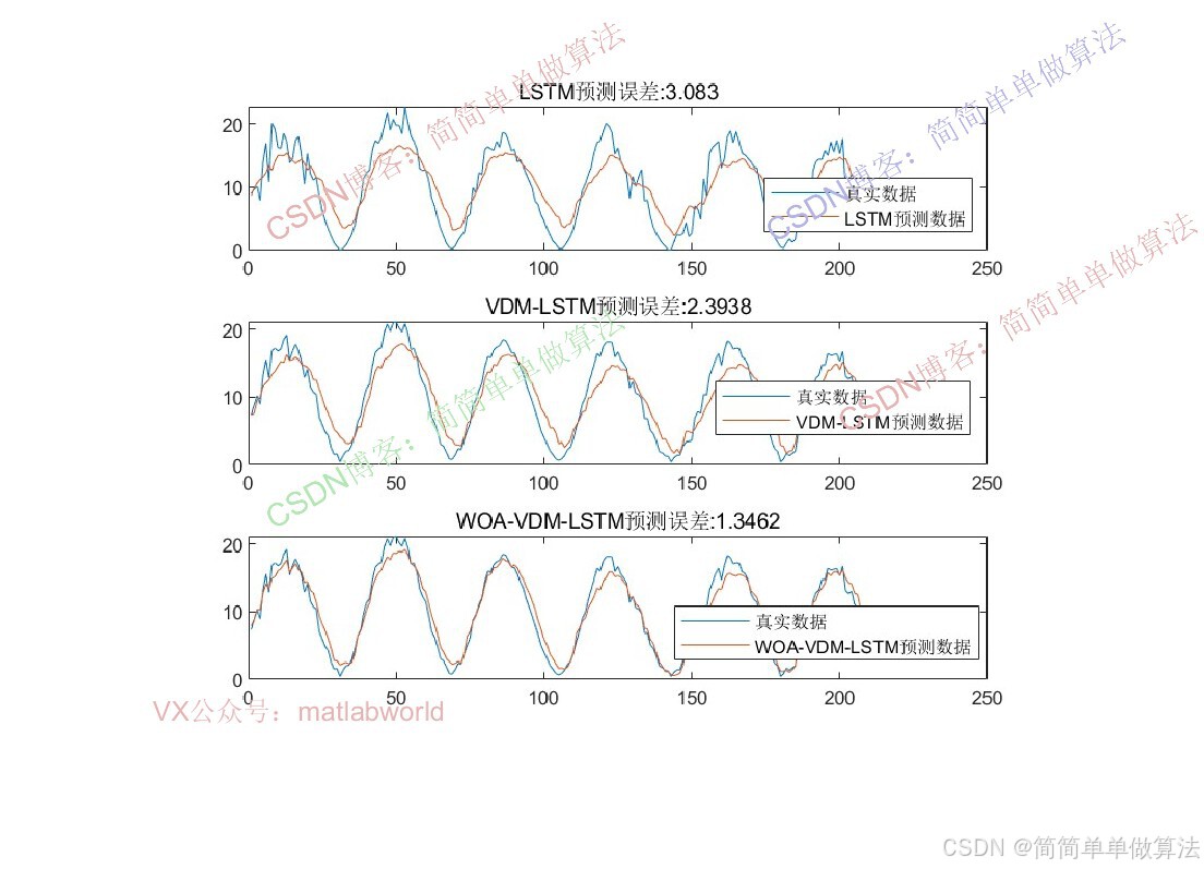 时间序列预测在能源、气象等领域具有重要应用价值。传统方法如ARIMA、SVM等在处理非线性、非平稳序列时存在局限性,而深度学习模型(如LSTM)虽能捕捉时序特征,但对初始参数敏感,且复杂序列需预处理以提升预测精度。变分模态分解(VMD)可将复杂时序分解为多个平稳模态分量,LSTM可有效建模序列长期依赖关系,WOA优化则用于优化LSTM的关键参数,形成 “分解-优化-预测” 的完整框架。该算法通过多技术协同,提升时序预测的准确性和鲁棒性。