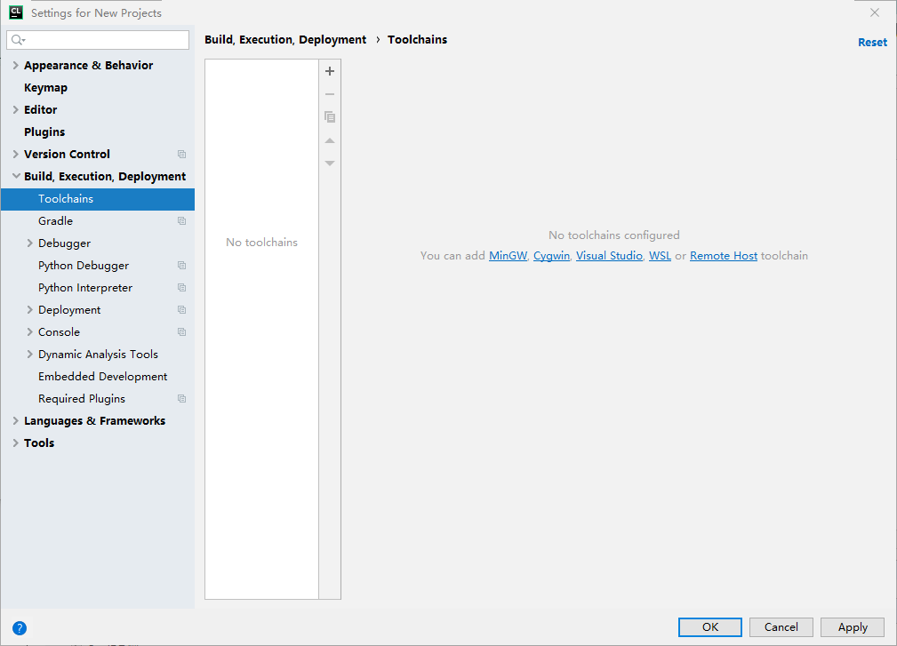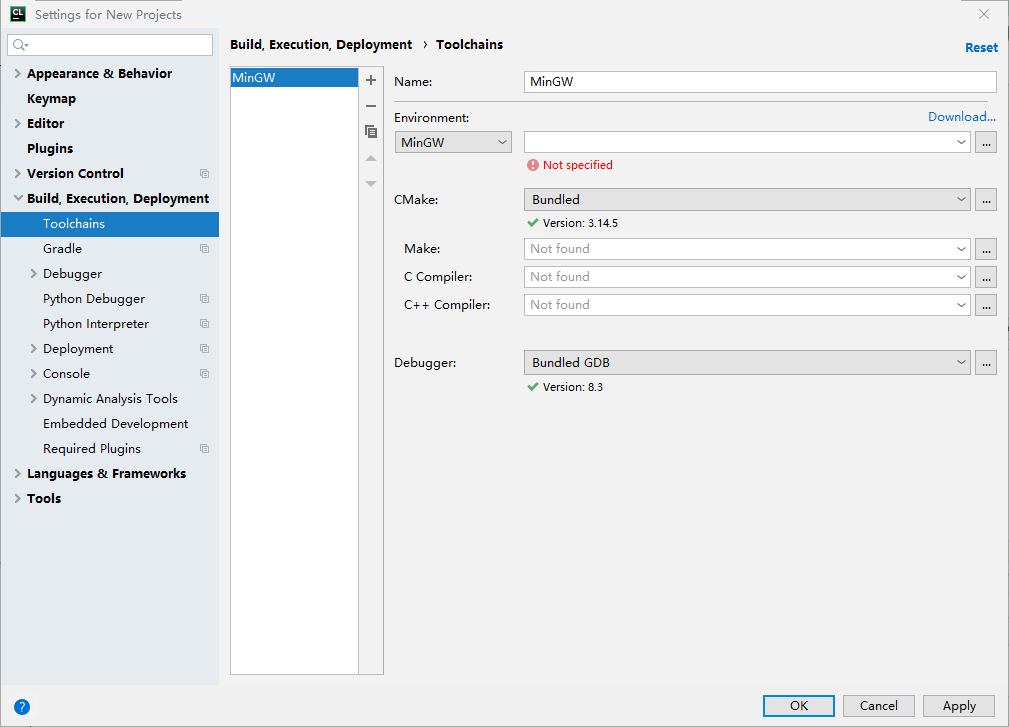 点击"+", 将"Environment"调整为"MinGW", 如图所示: