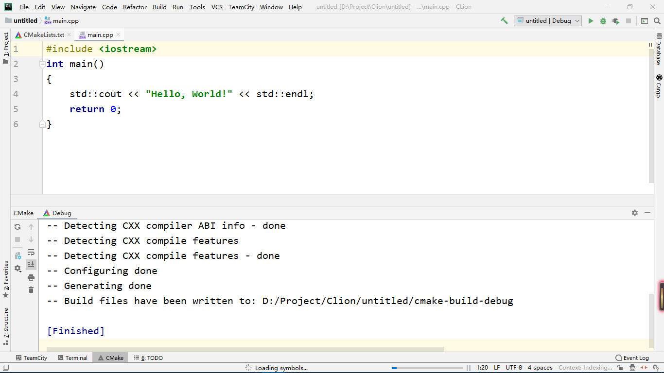创建一个项目后, 需要加载 CMake, 这时候一定要查看是否 Finish, 全部加载成功后如下图所示: