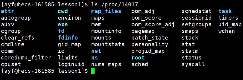 我们的进程就一直的跑着,再打开一个窗口,通过 $ls proc 指令检视该进程信息: