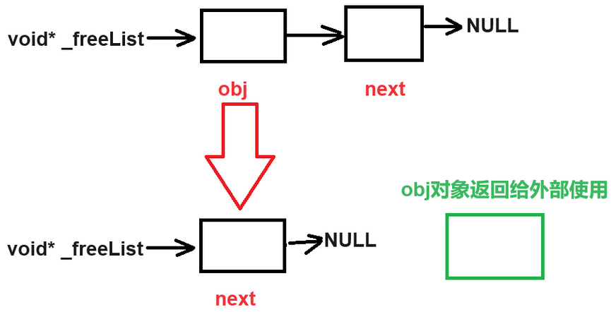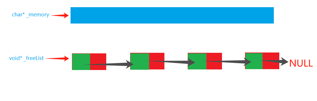 - _freelist:程序释放空间时,我们不用还给操作系统,而是用自由链表来连接起来,当下次申请空间时,先在自由链表中找,我们需要一个指针来指向链表的头部。