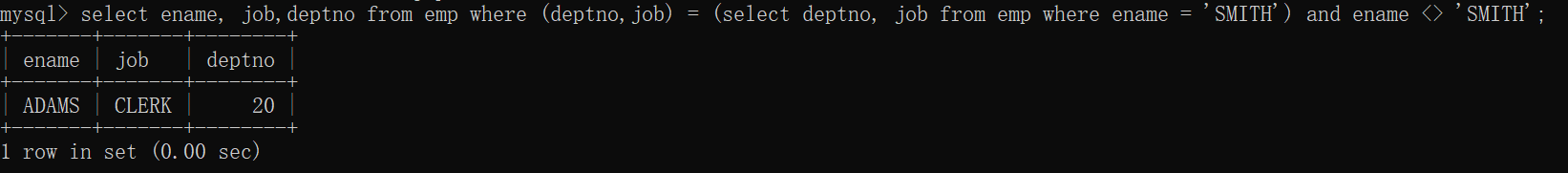 select ename, job,deptno from emp where (deptno,job) = (select deptno, job from emp where ename = 'SMITH') and ename <> 'SMITH';