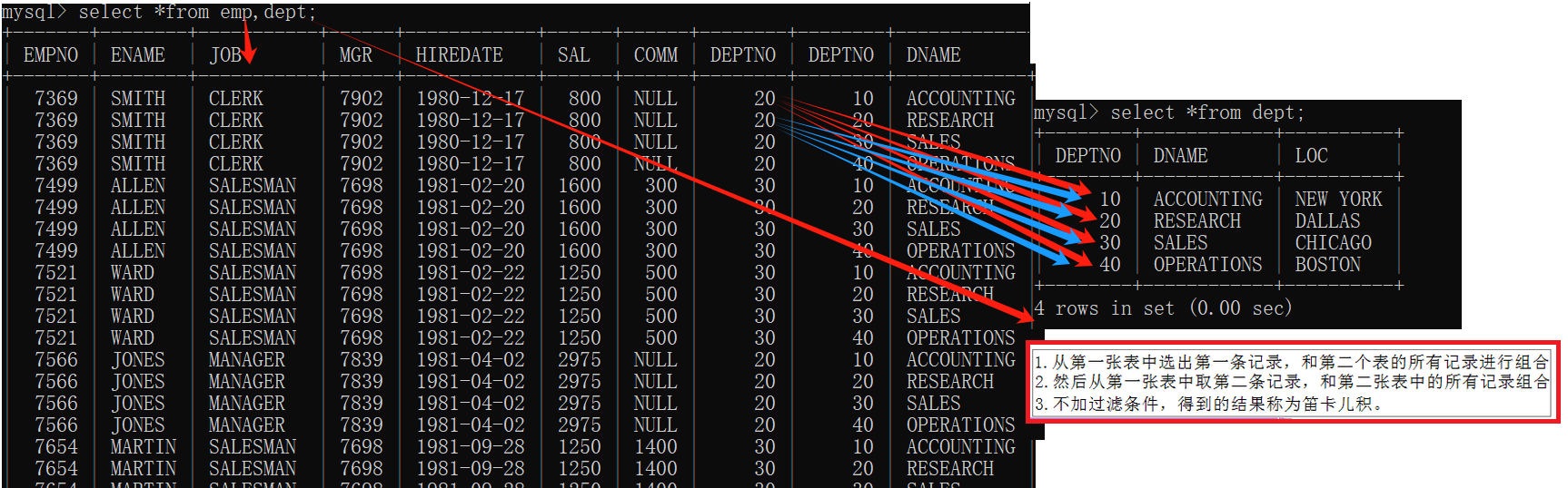 这种将多个表的数据进行组和穷举,我们称为笛卡尔积。