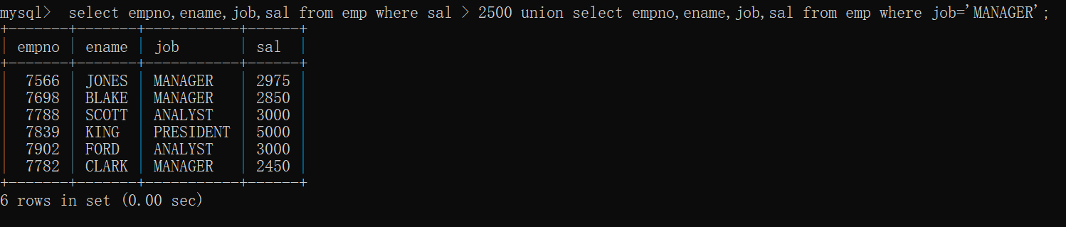 select empno,ename,job,sal from emp where sal > 2500 union all select empno,ename,job,sal from emp where job='MANAGER';