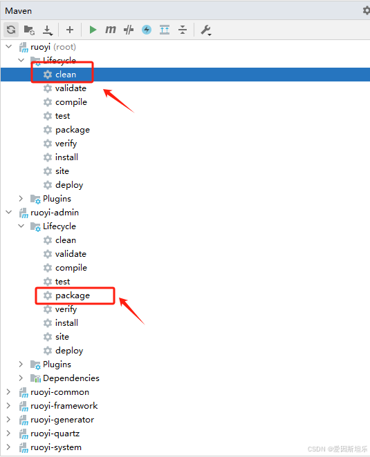打开右侧的maven面板,先点根目录下的clean,再点ruoyi-admin下的package